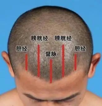 一手五指张开,呈鹰爪状,五指指尖立起,中指位于前发际头部正中的督脉线上,食指和无名指位于膀胱经线上,拇指与小指位于胆经线上。从前发际开始,沿经脉循行线向头顶点按。
