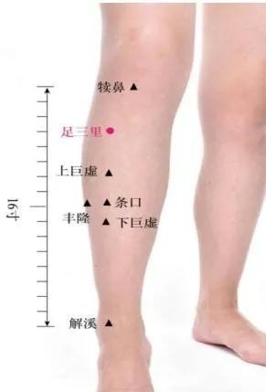 取法:正坐屈膝位,膝盖外侧凹陷向下量 4 横指(食指、中指、无名指及小指并拢,以中指近掌的指间关节为基线),小腿前突出的骨头旁 1 横指(中指)。