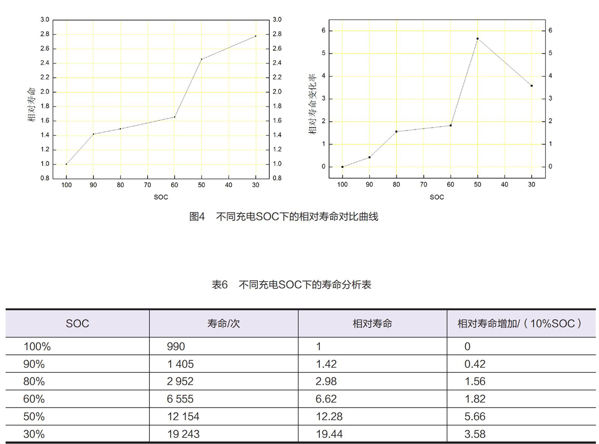 为此,本文考察90%、80%、60%、50%、30%5种SOC下的磷酸铁锂电池循环寿命,并与100%SOC下的循环寿命进行比对。