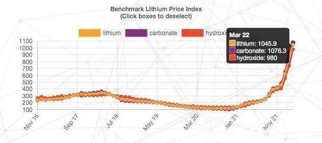 追踪全球电池供应链的市场研究机构Benchmark Mineral Intelligence的数据显示,从2019年底到今年3月,电池级钴的价格大约上涨了两倍,硫酸镍、碳酸锂上涨了约85%和670%。乌克兰危机发酵后,由于来自俄罗斯的镍供应受阻,镍价也翻了一倍多,创史上新高。